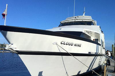 The Cloud Nine III is a 95 foot, custom built luxury yacht with all the amenities of a fine ship. The main Dining Room floor has a full service bar, and seating for 75 guests.